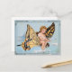 This enchanting postcard features a high-quality reproduction of a charming 19th-century Victorian greeting card design. An adorable, plump-cheeked baby Cupid or Angel with flowing golden curls is shown sitting regally upon the back of a majestic Giant Swallowtail Butterfly.