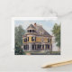 Ilustracion vintage de una hermosa casa victoriana de varias plantas con un gran porche y torreta.