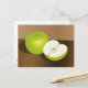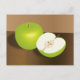 Tarjeta postal en un ilustracion digital de una manzana y media verde sobre un fondo café y textura marrón