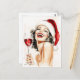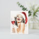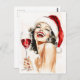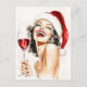 Un impresionante ilustracion acuático de una mujer de estilo vintage clásica adornada con un sombrero de Santa, irradiando alegría mientras ríe mientras sostiene un vaso de vino tinto. Sus glamorosos labios rojos, cabello perfectamente peinado y su elegante conducta encarnan las vacaciones atemporales con un toque de encanto retro.
