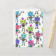 con un ilustracion digital de una multitud de robots multicolores de estilo antiguo. Cada una tiene una bombilla en la cabeza y muchos botones en el pecho.