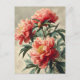 La postal vintage presenta una escena cautivadora de peonías exuberantes en plena floración, sus tonalidades vibrantes que captan la esencia de una era pasada. Los pétalos delicados muestran un espectro de rosa y blanco, creando una mezcla armoniosa que irradia belleza intemporal. El entorno da a un jardín rústico, con toques de verduras descoloridas y sutiles tonos sepia, que le confieren un encanto nostálgico a la composición general. Los bordes de la postal llevan el suave desgaste del tiempo, un testimonio de su viaje a través de los años.