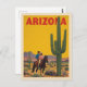 A bold, sun-drenched vintage-style travel poster featuring an artistic illustration of a couple riding horseback through the Arizona desert. The design captures the iconic Saguaro cactus against a bright yellow sky and distant mountains, evoking a classic Southwest and Western movie aesthetic. This retro-inspired artwork is perfect wall décor for travel enthusiasts, fans of cowboy culture, and those who appreciate the bold aesthetics of mid-century modern prints.