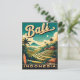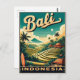 • This retro-style travel postcard captures the beauty of Bali, Indonesia, featuring lush green rice terraces, tropical palm trees, traditional Balinese architecture, and a majestic volcano under a serene sky.