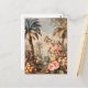 This artwork evokes the elegance of a timeless tropical paradise, blending lush palms, blooming flowers, and ripe fruit into a richly detailed botanical scene. Tall palm trees rise gracefully against a softly aged sky, their fronds rendered with painterly care that recalls classic 18th- and 19th-century landscape illustrations. In the foreground, abundant blossoms in warm shades of pink, coral, and cream mingle with citrus fruit and dense greenery, creating a composition that feels both cultivated and wild.