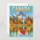Capte la belleza de Canadá con esta postal de viaje de estilo vintage que cuenta con una acogedora cabaña junto al lago, colorido bosque de otoño, montañas rocosas nevadas y una clásica canoa roja reflejada en el agua.