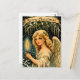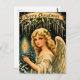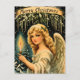 Esta vintage postal navideña presenta un ángel sereno sosteniendo una vela encendida en su mano derecha. Tiene rizos dorados y su expresión pacífica se ilumina con la luz de las velas. El ángel está vestido con una bata blanca, con sus alas suaves y pluviosas, sobre un fondo de árboles verdes y verdes de la nieve, y músculos colgados de ramas. Encima del ángel, la frase "Feliz Navidad" está escrita en negritas, elegantes letras en un cartel dorado. La escena general transmite calidez, paz y un espíritu vacacional clásico con sus obras de arte detalladas y su entorno invernal.