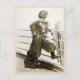 Foto vintage de una mujer disfrazada de vaquera sosteniendo una guitarra con su pie arrancado en un pasamanos. La foto original era de finales de los años 20.