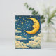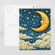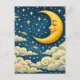 Drift into sweet dreams with this vintage illustration of a smiling crescent moon cradled in a starry night sky. A warm golden moon with rosy cheeks and closed eyes beams serenely amid twinkling white and yellow stars, swirling clouds, and streaking shooting stars on a deep indigo background. The distressed, storybook texture evokes nostalgic celestial wonder and cozy bedtime.