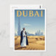 Experience the dazzling contrast of desert and metropolis with this striking vintage-style travel poster postcard for Dubai, UAE. The design captures a commanding view of the golden sand dunes where a caravan of camels treks, set against the futuristic skyline dominated by the magnificent Burj Khalifa. A figure in traditional Emirati attire (Kandura) stands proudly in the foreground, bridging the city's rich heritage with its modern ambition. The clear blue sky and warm desert tones create a luxurious, dramatic feel. This is a perfect postcard for fans of Middle Eastern travel, collectors of retro desert art, or those celebrating the innovation of the UAE.