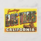 Esta es una postal clásica de estilo vintage que presenta la frase "Saludos desde grandes árboles, California". Las letras grandes y estilizadas de los GRANDES ÁRBOLES contienen cada una una escena única de los bosques de secuoya gigantes, incluyendo imágenes de árboles imponentes y vida silvestre como ciervos. El diseño tiene un estilo nostálgico, a mediados de siglo, con su paleta de colores retro y su fuente audaz, lo que lo hace perfecto para productos como postales, posters y camisetas para todo aquel que ame el arte de viajes vintage o los majestuosos bosques de secuoyas de California.