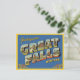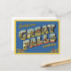 Esta es una postal clásica de estilo vintage que presenta la frase "Saludos desde grandes cataratas, Montana" en letras grandes y estilizadas. Las cartas de las GRANDES FALLS contienen escenas y monumentos únicos de la ciudad, incluyendo puentes, edificios históricos y el paisaje natural circundante. El diseño tiene un estilo nostálgico, a mediados de siglo, con su paleta de colores retro y su letra audaz, lo que lo hace perfecto para productos como postales, posters y camisetas para todo aquel que ame el arte de viajes vintage o la ciudad de Great Falls.