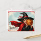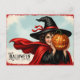 Esta es una postal de Halloween de estilo vintage con una orientación horizontal, diseñada para parecer envejecida con un borde rojo angustiado. El tema principal es un joven chica, vestido de bruja, sosteniendo una calabaza tallada. El chica tiene el pelo oscuro, rizado y una tez pálida con las mejillas rosadas. Lleva puesto a un gorra de una bruja negra grande y puntiaguda, con una cinta roja y una capa roja voluminosa que se extiende alrededor de sus hombros. Ella está mirando al espectador con una sonrisa tímida y juguetona. Lleva una clásica linterna jack-o' con ojos triangulares y una boca ancha y sonriente. La calabaza se ilumina desde adentro, lo que da un resplandor cálido. En la esquina inferior izquierda de la imagen, la palabra "Hallowe'en" está escrita en un guión decorativo de estilo gótico. El fondo es azul claro y suave, con un toque de nubes. Toda la imagen tiene un aspecto texturado y colorido a mano, lo que le da un toque de encanto y nostalgia.