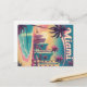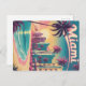 Un animado afiche de viajes al estilo de los años 80 captura una colorida puesta de sol sobre Miami Beach, con prominentes palmeras y edificios Art Deco a lo largo de la costa, con "Miami" en un guión elegante en la parte superior.