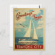 Este diseño náutico de viajes vintage de Greetings From Traverse City Michigan presenta un barco navegando en el agua con gaviotas y un cielo azul lleno de hermosas nubes blancas.