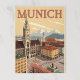 Disfrute del encanto de Alemania con esta postal clásica de Múnich! Cuenta con Marienplatz, con el nuevo ayuntamiento y el impresionante paisaje alpino. Los colores cálidos y anticuados y los sutiles granos realzan su estilo gráfico vintage, con una audaz tipografía "Múnich" en un estilo de los años 60.