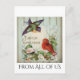 Postcard de todo propósito para cualquier evento orientado a la familia o simplemente enviar una nota amistosa. A las familias les encantará recibir esta vintage tarjeta de saludos de Pascua victoriana que presenta un fondo rústico de valla con dos coloridos pájaros azules y rojos en primer plano. El diseño evoca una época pasada con letras antiguas que dicen "Saludos de Pascua". Luminoso y alegre, con flores blancas y rosadas y bellas papeleras, este regalo será siempre apreciado.