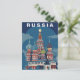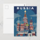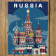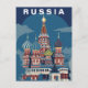 Capture the vibrant and whimsical spirit of Eastern Europe with this striking Russia Travel Card. This vintage-style illustration features a majestic cathedral complex, celebrated for its unique onion-shaped domes decorated with bold zig-zags, stripes, and brilliant shades of blue, red, and gold.