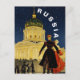 Step into a world of historic elegance with this striking Russia Travel Card. This vintage-style illustration features a majestic cathedral illuminated against a deep navy sky filled with falling snow.