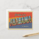 Este diseño es una postal clásica de estilo vintage que presenta la frase "Saludos desde Alabama" en letras grandes y estilizadas. Cada carta de ALABAMA contiene una escena única o un punto de referencia del estado, incluyendo la capital del estado, edificios históricos y paisajes naturales. La estética general tiene un ambiente nostálgico, a mediados de siglo, con su paleta de colores retro y su letra audaz, lo que la hace perfecta para productos como postales, posters y camisetas para todo aquel que ame el arte de viajes vintage o el patrimonio de Alabama.