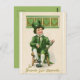 ¡Esta postal tiene un ilustracion vintage de un afortunado leprechaun! Está vestido de verde desde el sombrero de punta hasta el traje hasta los zapatos. Detrás de él hay corazones verdes. Tiene eslabones de espuma de shamrock y está sentado en una silla. Disfruta de tu nueva postal de San Patricio Amante Lucky Leprechaun!