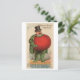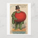 Esta postal es una reproducción de una vintage tarjeta victoriana que muestra a un hombre con el cuerpo de un tomate, usando un sombrero de cabeza y llevando un bastón para caminar.