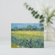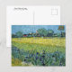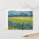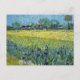 Postal con el cuadro, Vista de los Arles con los irlandeses (1888) del artista holandés Vincent van Gogh (1853-1890) Un hermoso paisaje de campos de trigo al lado de un prado de hierba y una hilera de flores de iris en primer plano.