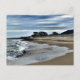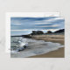 Sentado en la playa por la noche, viendo cómo las nubes lluviosas se movían por el cielo. La marea está entrando y la pequeña ciudad de Tywyn se muestra a lo lejos. Gwynedd Wales UK.