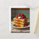 Postal con temática gastronómica. Ilustracion de gofres con fresas, arándanos, jarabe y mantequilla sobre un plato de bonito antiguo.
