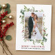 Elegante color de agua verde invierno Feliz Navidad Boda Fototarjeta de vacaciones recién casada incluye hojas de eucalipto y bayas rojas.