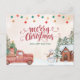 Esta encantadora postal de Navidades cuenta con un hermoso ilustracion acuático de una festiva escena invernal, con un clásico camión rojo con un árbol de Navidad, una acogedora casa cubierta de nieve y un alegre hombre de nieve. Los colores cálidos de las vacaciones, rojo y verde, combinados con adornos colgantes y delicados copos de nieve, hacen de este diseño el lugar perfecto para enviar un sincero saludo a amigos y familiares. Difunde la alegría de la temporada con esta deliciosa postal de vacaciones.