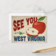Una encantadora postal de viaje vintage de Virginia Occidental con una hermosa manzana roja, junto con un divertido texto de estilo retro que dice, "Nos vemos en Virginia Occidental"