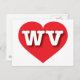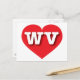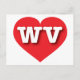 Esta postal tiene un vibrante corazón rojo que contiene las letras atrevidas, blancas y fundas superiores WV, la abreviatura oficial de Virginia Occidental, el estado montañoso. El reverso de la postal está en blanco, esperando el texto personalizado o los sentimientos manuscritos.