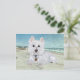 La arena suave y el mar turquesa proporcionan un bello telón de fondo para este territorio blanco de West Highland en una salida a la playa. Envíe saludos a sus amigos Estilo Westie con belleza y color! ¡Todas las ventas apoyan el rescate de West Highland White Terrier!