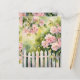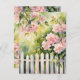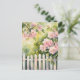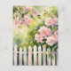 Pink flowers grow around a weathered, white picket fence on this postcard. Sweet and romantic, and very pretty! Perfect for anyone who loves flowers and gardening.