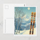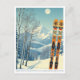 Hello from the snowy mountains of Whitefish Mountain Montana, USA! We hope you're having a wonderful ski vacation. This postcard features a gorgeous blue-grey mountain landscape with retro ski boards in an orange tribal pattern.