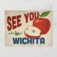 Una encantadora postal de viaje vintage de Wichita Kansas, con una hermosa manzana roja, junto con un divertido texto de estilo retro que dice, "Nos vemos en Wichita"
