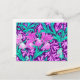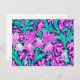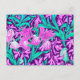 Postal en un William Morris, Art Nouveau, huella textil de iris y hojas, realzada digitalmente y coloreada, en orquídea suave y turquesa, sobre un fondo profundo de ametisto morado