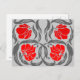 Postcard en un patrón textil de William Morris vintage de flores y hojas impermeables estilizadas - flores en un gradiente de color rojo oscuro a brillante, con hojas grises/grises de grafito, sobre un fondo gris plateado claro