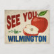 Una encantadora postal de viaje de Wilmington North Carolina con una hermosa manzana roja, junto con un divertido texto de estilo retro que dice, "Nos vemos en Wilmington"