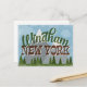 Windham New York diseño de viajes neo vintage en divertido estilo retro personalizado con montañas nevadas, bosques y árboles debajo, cielos azules y texto retro fresco.