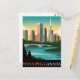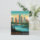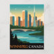 Afiche de viajes vibrante, de estilo retro para "WINNIPEG CANADÁ". Presenta un paisaje urbano estilizado con edificios modernos prominentes, que incluyen una alta y delgada pista. Una masa de agua con un puente cruza el primer plano, y hay árboles de silueta y pájaros en el cielo. La paleta de colores utiliza amarillos cálidos y naranjas para el cielo y los edificios, contrastando con tonos azules y verdes para el agua y el follaje, evocando un ambiente luminoso y acogedor.