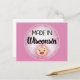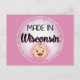 Esta graciosa postal muestra una cara de bebé blanca que dice "Hecho en Wisconsin" en un fondo rosado. Perfecto para invitaciones de recién nacido o sólo para diversión.