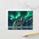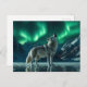 Un lobo solitario alto en un lago helado, con la cabeza inclinada hacia atrás y gritando hacia el cielo. El majestuoso animal es una silueta con un impresionante telón de fondo de las auroras boreales, sus vibrantes tonalidades verdes bailando a través del cielo nocturno. La escena es impresionante y captura la belleza y el poder crudos de la naturaleza.