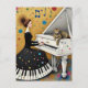 A woman with a piano print dress at a fancy white piano with a tabby cat and a gold and colorful music notes background