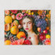 A woman poses with citrus fruits and a garland of flowers. The portrait combines freshness, color, and artistic styling in a lush natural setting.