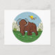 Un mamut marrón y lana mira al espectador. Ha levantado colmillos, abrigo peludo, ojos y oreja pequeños y un gran baúl largo.