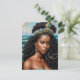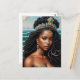 This African deity and royal-core postcard features a classic oil painting style portrait of Yemaya (also known as Yemaja and Yemoja), Yoruba orisha of the ocean and other bodies of water. She is depicted here as a striking black woman wearing an ornate crown atop long natural hair twists, partially styled down and in an updo. Turquoise and gold jewelry complement her rich dark brown skin, and a few strings of pearls are fused in her long hair.