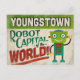 Un divertido diseño de viaje de la época de Youngstown Ohio presentando un robot amistoso con un divertido texto de estilo retro que dice, "¡Youngstown, la capital del Robot del mundo!"