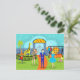 Esta postal del zoo vintage muestra a una familia de estilo clásico de la televisión de los años 50 en una excursión de fin de semana. Este moderno diseño de arte minimalista de mediados de siglo cuenta con un dibujo personalizado de un día perfecto en el zoológico. Sí, es un día hermoso para una salida familiar y has venido al lugar correcto. Pasar por la puerta de hierro forjado, debajo del cartel amarillo con letras rojas que dice "ZOO". Una vez en el interior, verás un camino de piedra naranja flanqueado por un verde y exuberante césped. En una jaula grande se ve el majestuoso león. Este naranja y rey amarillo de la jungla mantiene sus ojos en un adorable chica rubio vestido de rosa que, por casualidad, le mantiene los ojos puestos. En el lado opuesto del paseo, no te puedes perder la gigantesca jirafa amarilla y marrón de un recinto redondo. Está a la altura de los ojos con la palmera balanceada al fondo. Un joven novio vestido con una camisa roja brillante y un jeans azul está apurado por llegar a algún lugar. ¡Oh, mi! Parece que le está haciendo una línea a un zookeeper. El dueño del zoológico se viste apropiadamente con pantalones cortos de caqui, camisa y gorra. ¿Qué está sosteniendo? ¡Un mono! ¿Y qué es lo que el dinero tiene? ¡Un plátano! ¡Amigos, no es mejor que esto! Parados en el camino, vemos a papá. ¡Guau! Me alegra ver que sabe que vale la pena lucir lo mejor, incluso en un día libre de la oficina. Lleva traje azul, camisa azul clara y corbata roja. Papá le está regalando tres globos, en tonos naranjas, azules y rojos a mamá. Mamá está usando un vestido azul con una forma que combina corpiño y falda flarroja. Su peinado rubio y coqueteado se está convirtiendo. El cielo, en tonos agua, verde azulado y azul, está lleno de estrellas mágicas y blancas. Al igual que el zoo, este diseño es divertido para toda la familia y es perfecto para niños de todas las edades.
